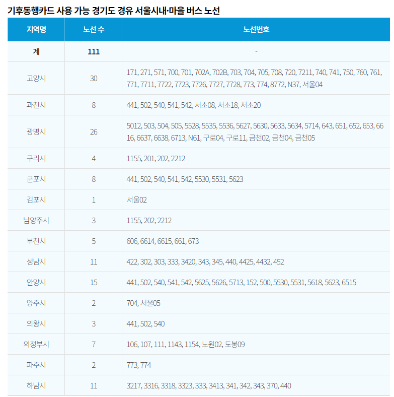 서울시 면허로 경기도를 경유하고 있는 시내버스 즉!! 경기도에서 기후동행카드를 사용할 수 있는 노선표 공유드리겠습니다. 해당하는 버스를 자주 이용하시거나 출퇴근하시는 분들은 기후동행카드 이용을 추천드립니다.